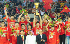 9月25日,中國隊球員在領獎臺上慶祝。當日,在武漢進行的第26屆男籃亞錦賽決賽中,中國隊以70比69戰勝約旦隊,奪得冠軍。新華社記者程敏攝