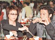 謝霆鋒前晚宴請一班同事吃過“答謝宴”后,昨日與陳冠希、阿倫及莫文蔚等人飛赴寧波,出席一個環保音樂會。
