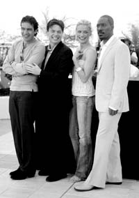 本報綜合消息 昨天,本屆電影節競賽單元影片、好萊塢夢工廠制作的動畫大片《怪物史萊克Ⅱ》在戛納首映。該劇主要配音演員亮相盛大的媒體見面會,麥克·邁爾斯(飾史萊克)、卡梅隆·迪亞茲(飾公主)、艾迪·墨菲(飾驢子)、安東尼奧·班德拉斯(飾穿靴子的貓)等好萊塢巨星衣著隨意,卡梅隆·迪亞茲在三大男星的簇擁下以吊帶背心配牛仔褲搶盡風頭。