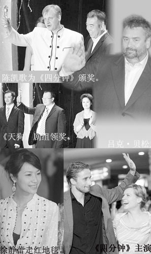 頒獎典禮沒有太復雜的程序,首先頒出的是最佳音樂獎,由新西蘭影片《河道女王》獲得,比利時電影《愛無專屬》榮獲最佳編劇與最佳女演員獎,法國電影《心力交瘁》獲得最佳導演和最佳男演員兩個重量級獎項。分量最重的金爵獎由呂克·貝松與陳凱歌頒出,由德國影片《四分鐘》獲得,這部影片歷時8年拍攝。而之前剛剛在記者評出的傳媒大獎上獲得最佳視聽效果獎的《理發(fā)師》一獎未獲,另一中國參賽片《天狗》獲得評委會大獎,是中國電影獲得的唯一獎項。