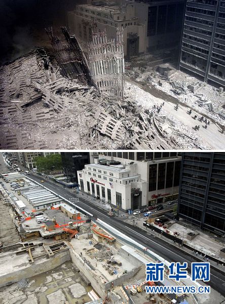 這是“9·11”事件發生近9個月后,遭受毀滅性襲擊的美國紐約世貿中心已經從一片廢墟(上圖,攝于2001年9月11日)變成一個新的建筑工地(下圖,攝于2002年6月4日)。新華社發(程麗編輯)