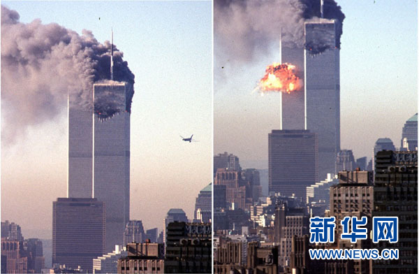 這是當日紐約世界貿易中心遭受飛機撞擊的組照。新華社發