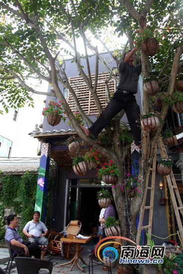 備受矚目的博鰲小鎮,以椰子做成的“天然盆景”扮靚街頭樹枝,別致而獨特,使喜慶的氛圍顯得十分濃烈(南海網記者張茂攝)