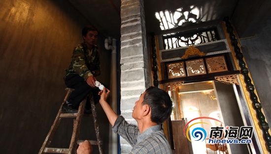 工人們在博鰲鎮一家家庭旅館粉刷墻面。據該店老板介紹,該店將趕在年會召開前開張迎客(南海網記者張茂攝)