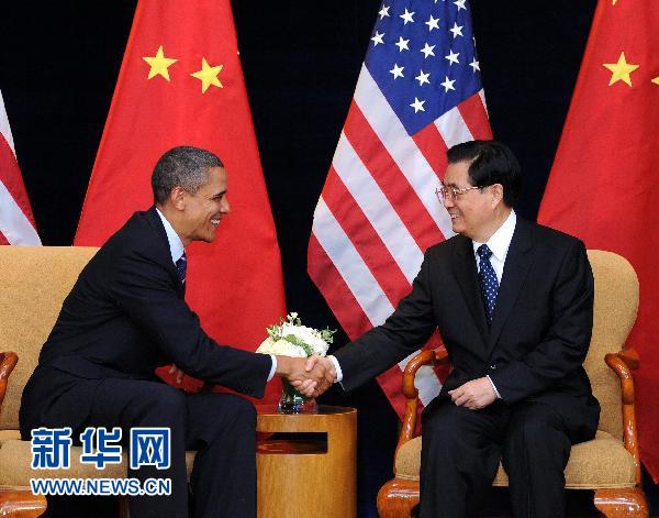 資料圖片:2010年11月11日,中國(guó)國(guó)家主席胡錦濤在韓國(guó)首都首爾同美國(guó)總統(tǒng)奧巴馬舉行會(huì)晤。新華社記者劉建生攝