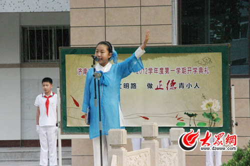 [提要] “學(xué)做人,講文明,禮儀之邦人知曉。樹(shù)校風(fēng),強(qiáng)校紀(jì),正德文明記心里。”開(kāi)學(xué)第一天,濟(jì)南市青龍街小學(xué)組織了以“走至善文明路 做正德青小人”為主題的開(kāi)學(xué)典禮。小學(xué)生們穿上古裝,朗讀起修生養(yǎng)性的《正德歌》。