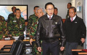 交火事件后,韓國總統李明博(前)抵達韓國軍隊聯合參謀本部控制中心,召開緊急會議。