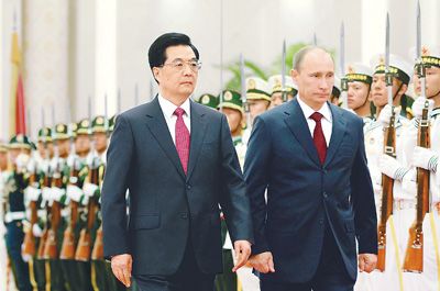 [提要] 6月5日,國家主席胡錦濤在北京人民大會堂主持儀式歡迎來華進行國事訪問并出席上海合作組織成員國元首理事會第十二次會議的俄羅斯總統普京。兩國元首表示,雙方將加強配合,使即將召開的上海合作組織北京峰會取得成功,推動上海合作組織向前發展。