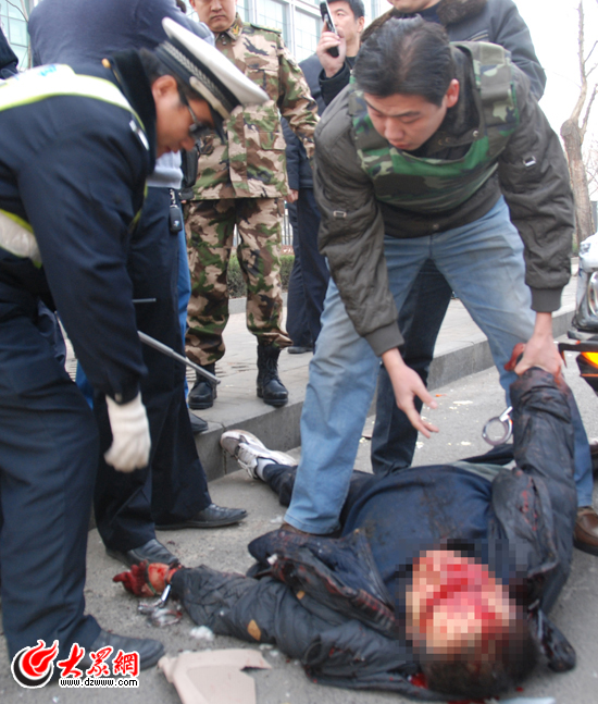 記者沿事發地點向東步行,發現此路段正位于山東農業大學后門附近,從撞車地點到歹徒就擒地點約有600米的路程。記者在擒獲歹徒現場注意到,攤點地面上仍散落著車輛撞擊留下的玻璃碎片,擒獲現場路面上的兩大片血跡已被沙土掩埋。