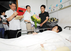 7月7日,杭州市見義勇為基金會工作人員來到杭州富陽市中醫骨傷醫院,看望慰問因勇救墜樓兒童而負傷的“最美媽媽”吳菊萍,并宣布授予她“杭州市見義勇為積極分子”稱號。